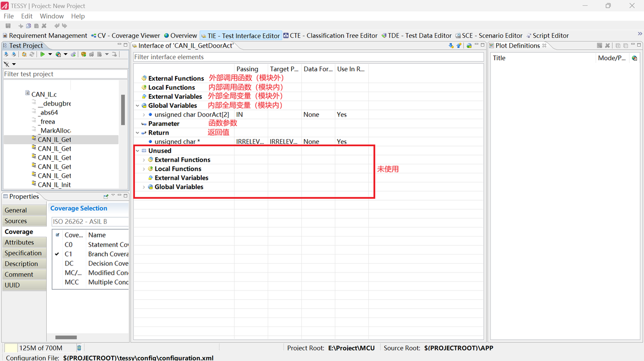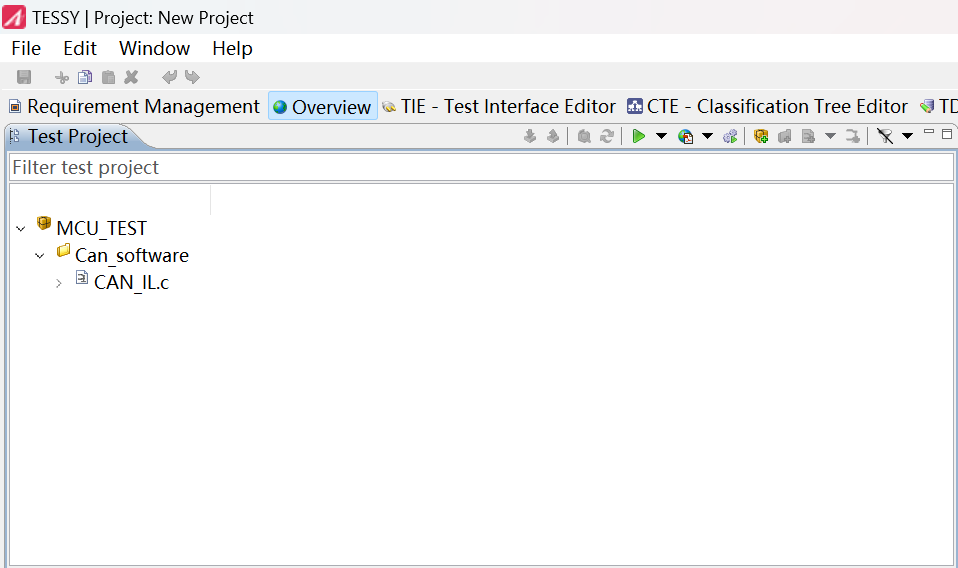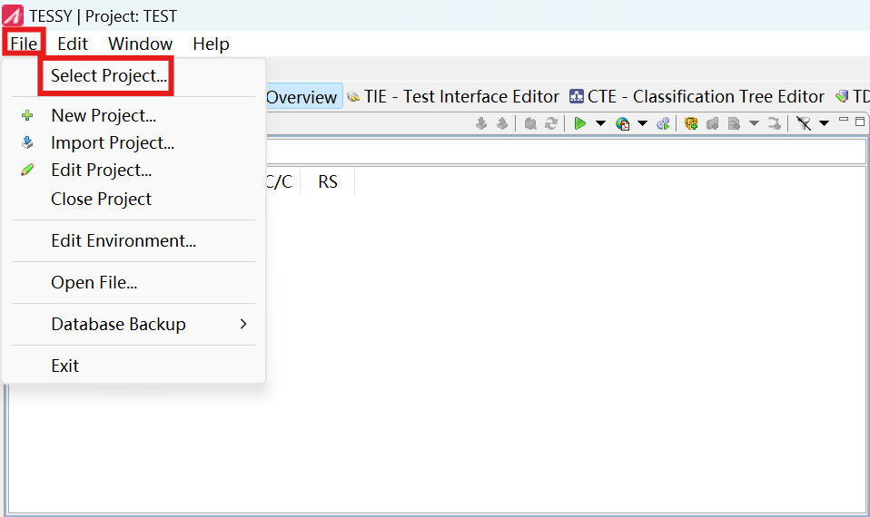 - 创建成功后,Tessy重启,首次会直接进入刚创建的工程,多个工程切换可以点击File选择Select Project选中你需要打开的工程