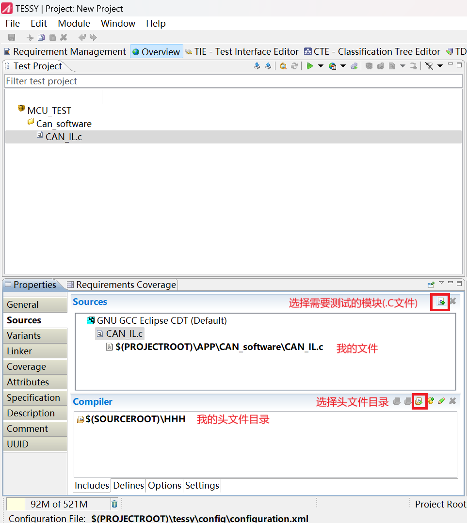 - Source配置如下,添加需要测试的模块;添加头文件目录